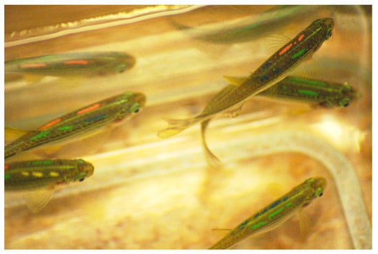 Over the past thirty years, zebrafish (Danio rerio) have become a popular vertebrate model organism in science [1]. Zebrafish are used to study various human diseases [2], drug developments, toxicological effects [3], and various other topics in biomedical research [4]. Recently, this model has started to become popular in behavioural, ecological, and evolutionary research as well [5,6,7,8,9,10]. In 2013, it was estimated that more than 3000 institutions in over 100 countries used zebrafish for research [11,12]. The use of this fish species in research offers several advantages: low cost of maintenance, simplicity in holding and breeding [13,14], high fecundity, small size, rapid developmental and generation times, transparent embryos, the ease of its genome manipulation to create mutant or transgenic lines, and their genetic similarity to humans [14,15,16,17]. The increased popularity of specific genetic modification techniques, such as CRISPR-Cas9, has also mean that zebrafish have become the organism of choice in large-scale genetic studies [12,17].