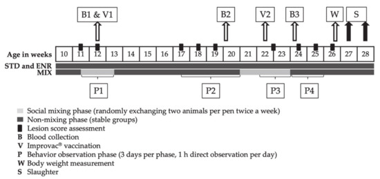 The three sex categories were subdivided and further allocated to three different housing environments, which will be further referred to as enriched (ENR, n = 36), standard (STD, n = 36), and mixing (MIX, n = 72). Each pen was equipped with a solid floor, a nipple drinker, minimal litter and a metal chain with an organic element as manipulable material. All pigs were provided ad libitum access to feed with the same standard diet [33] and provided with natural light. Differences with regard to housing conditions resulted from different space allowances in the pens (STD and MIX: 1.2 m2/pig indoors, ENR: 2.8 m2/pig indoors plus 3.2 m2/pig outdoor area) and from trough length and thus the possibility of synchronous feeding of all 6 animals in the pen (STD and MIX: not given with 20 cm/pig, ENR: given with 40 cm/pig). Social mixing (MIX) consisted of interchanging two pen mates within each sex every third day and was carried out within two weeks around the first Improvac® vaccination (five mixing events) and three weeks around the second vaccination (eight mixing events) of immunocastrates, whereas EM-MIX and BA-MIX pens were mixed at corresponding time points. For this reason, two MIX pens existed per sex category and trial, resulting in double the number of animals for the MIX treatment. Animals were interchanged between those two pens throughout the respective trial. No littermates were present within any given pen of pigs. Animals were housed in groups of six. The health status of the animals was assessed twice a day by trained personnel. On the experimental unit a comprehensive hygiene framework was applied, including working after the all-in/all-out principle to cut off infection cycles and working in closed on-farm cycles by restocking breeding animals from the own herd. The piglets get vaccinated against Mycoplasma hyopneumoniae at the age of 3 weeks. The experimental design of the study is given in Figure 1.
