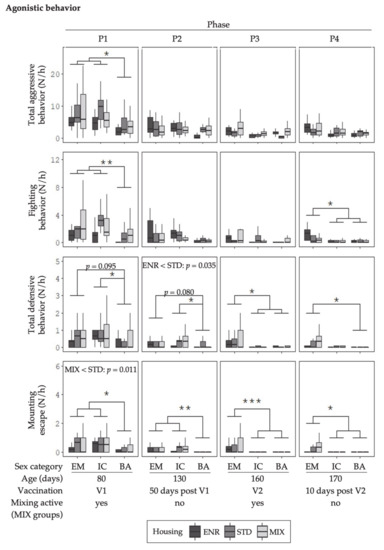 Mean number of occurrences (N) of agonistic behaviors per hour (h) for each animal are given as boxplots for the sex categories (EM = entire males, IC = immunocastrates, BA = barrows) in the different environments (ENR = enriched, STD = standard, MIX = mixing). Columns represent the data of animals in four behavior observation phases (P1–P4). V1 represents phases before, and V2 after the second immunization of IC. The MIX pens were mixed in P1 and P3. Note: no mixing was done in STD and ENR at any time. Significant differences between sex categories are indicated by asterisks (*** p < 0.001, ** p < 0.01, * p < 0.05). Housing differences are annotated with p-values in the graphs respectively. Boxplots show the minimum value with respect to the interquartile range, the 25th percentile, the median, the 75th percentile and the maximum value with respect to the interquartile range.