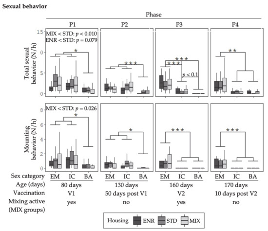 Mean number of occurrences (N) of sexual behaviors per hour (h) for each animal are given as boxplots for the sex categories in the different environments. Columns represent the data of animals in four different behavior observation phases (P1–P4). V1 represents phases before, and V2 after the second immunization of IC. The MIX pens were mixed in P1 and P3. Note: no mixing was done in STD and ENR at any time. Sex categories were: EM = entire males, IC = immunocastrates, BA = barrows; Housing environments were: ENR = enriched, STD = standard, MIX = mixing. Significant differences between sex categories are indicated by asterisks (*** p < 0.001, ** p < 0.01, * p < 0.05). Housing differences are annotated with p-values in the graphs respectively. Boxplots show the minimum value with respect to the interquartile range, the 25th percentile, the median, the 75th percentile and the maximum value with respect to the interquartile range.