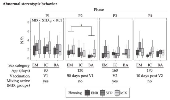 In P1, a housing effect was noted for abnormal stereotypic behavior in a way that STD animals showed it more often compared to MIX animals.