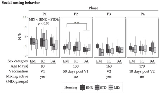 The sex category influenced social nosing in P2, whereby EM showed greater numbers than BA (Figure 5).