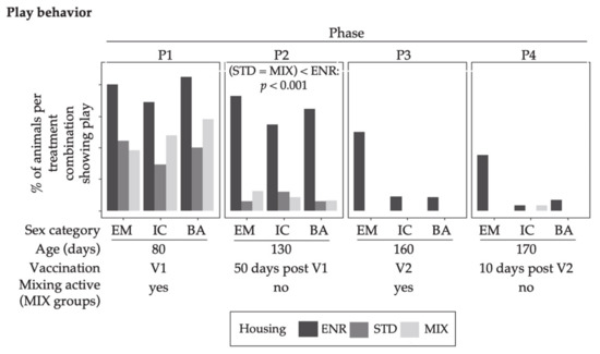 However, an effect of housing existed in P2. The share of ENR animals showing play behavior was greater than for STD and MIX treatments.