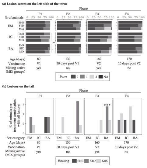 Percentages of animals of the treatment combinations (Sex categories: EM = entire males, IC = immunocastrates, BA = barrows; Housing environments: ENR = enriched, STD = standard, MIX = mixing) with (a) certain lesion scores on the left side of the torso and (b) lesions on the tail (score 1). Columns represent the data of animals in four different behavior observation phases (P1–P4). V1 represents phases before, and V2 after the second immunization of IC. The MIX pens were mixed in P1 and P3. Note: no mixing was done in STD and ENR at any time. Significant differences between treatment combinations are indicated by asterisks (*** p < 0.001, ** p < 0.01, * p < 0.05).