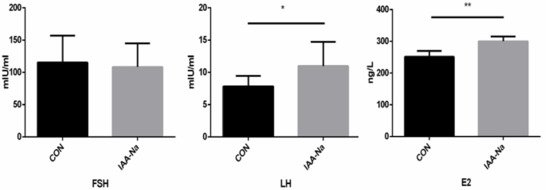 Effect of dietary IAA-Na supplementation on serum hormone levels in Danzhou chickens. Note: CON = basal diet, and IAA-Na = basal diet plus 200 mg/kg diet sodium indole-3-acetate. E2 = estradiol; FSH = follicle-stimulating hormone; and LH = luteinizing hormone. * and ** indicate a trend to a significant difference (0.05 ≤ p < 0.10) and a statistically significant difference (p < 0.05), respectively.