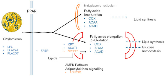 Gene ontology and pathways enrichment analysis identified 16 metabolic pathways significantly associated with an adjusted p-value < 0.1, most of which are related to the lipid metabolism (Table A2). In Table 2, we show three metabolic pathways with the highest number of DEG whose function is associated with lipids absorption, fatty acids synthesis and catabolism, and adipocyte differentiation. The influence of these three metabolic pathways in pig IMF content was previously reported in other independent studies that compared the fatness and fatty acid composition of different pig populations [22,23,24]. Interestingly, 30 DEGs, from a total of 220 genes associated with these lipid metabolic pathways, promoted lipid absorption, synthesis, and fat cell differentiation. In fact, most of these 30 genes were upregulated in the RR variety, except for the ADIPOQ, CPT1A and SREBF1 genes, with some exceptions (Table A2).