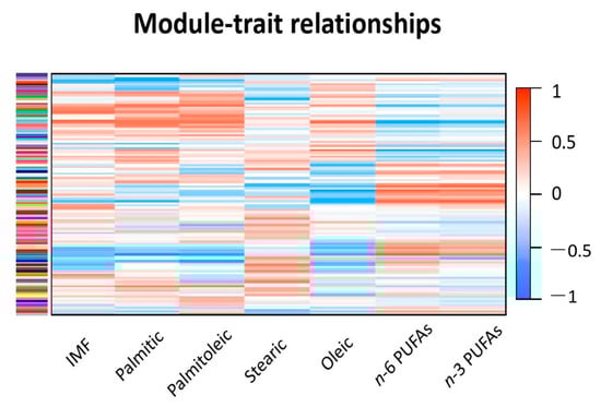 The gene count matrix with the rlog values was then submitted for weighted gene co-expression analysis with the WGCNA package. After filtering out 5554 genes with missing expression values in most of the samples or with zero variance, a total of 20,046 genes were used for weighted gene co-expression network construction. As a result of network construction, 113 modules (i.e., cluster of co-expressed genes) were found by WGCNA analysis. These modules were identified by different color names, and their size ranged from 3374 to 30 genes with ME p-value < 0.05. The correlations between the 113 gene modules and the SM traits are displayed with a heatmap in Figure 1. The heatmap shows the strength of the correlations between modules and traits: the darker (dark blue and dark red) the colors, the stronger the correlations. As can be noticed, palmitic and palmitoleic acids show similar patterns of colors (and thus similar correlations with the modules) when compared to IMF. Oleic acid shows opposite correlations when compared to n-3 and n-6 FA. In fact, the modules that were positively correlated with oleic acid were negatively related to the percentage of n-3 and n-6, and vice versa. On the other side, stearic acid showed patterns of correlations different from the ones noticed for the other traits and of weaker magnitude, as indicated by the lighter colors found in the stearic acid column.