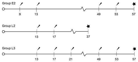 Figure 2 and Figure 3 show the scrotal sac height and width evolution throughout the study. At the priming dose, values started at around 4 cm in height in nine-week-old animals and increased until they were 13 weeks old (GrpE2) or 17 weeks old (GrpL2, L3 and C). After the second administration, measurements decreased to values close to initial values in all treated animals until weeks 17 and 21 (GrpE2 vs. GrpL2 and L3). By then, the scrotal sac measurements increased and approximated the expected size of sexually mature animals. This process was slower in group L3, taking almost 16 weeks. The pre-established pubertal height and width were surpassed at 21 weeks of age in the control group, 29 weeks of age in group E2, and 37 weeks of age in group L2. Group L3 only overtook this value at 41 weeks old. Between weeks 41 and 49, scrotal dimensions in the treated animals became closer to those of the control group.