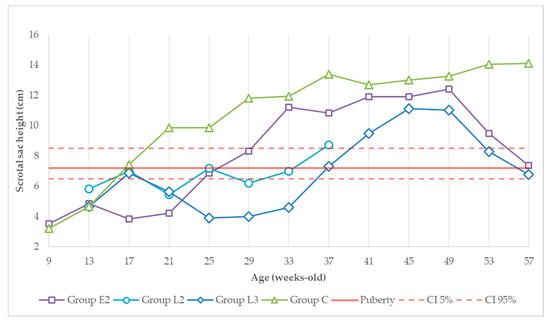 Evolution of scrotal sac height (cm) over experimental time. Red solid and dashed lines correspond to the predicted testicular length at puberty (95% confidence level) [32]. Dimensions from groups E2 and L3 in the 37th week and from the control group in the 33rd week were estimated.
