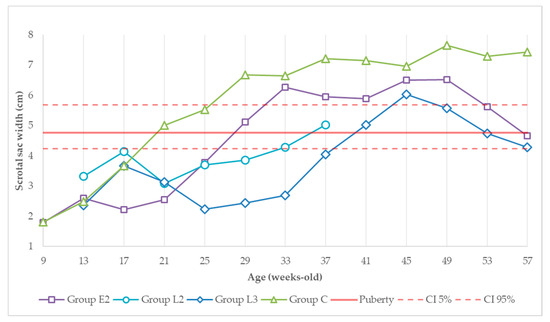 Evolution of scrotal sac width (cm) over experimental time. Red solid and dashed lines correspond to the predicted testicular width at puberty (95% confidence level) [32]. Dimensions from groups E2 and L3 in the 37th week and from the control group in the 33rd week are estimated.