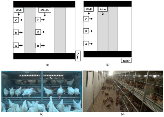 Aerial view of camera placements for (a) Style 1 and Style 2; (b) Style 3 rearing aviaries; (c) still shot from a low view into a Style 2 brooding compartment; (d) a still shot from a “wall” long view of a Style 2 rearing aviary. Blacked out areas are walkways for human traffic, unoccupied by pullets. The shaded sections are the aviary structures, and the white section is the litter area. Black lines separate rows of aviary structures. Cameras (represented by boxes) were located at the brooding compartment or panel section ¼ (A,D), ½ (B,E) and ¾ (C,F) down the aisle. At each letter location, one camera was positioned to view the litter floor and the bottom tier, and one viewed the top tiers of the system. Camera-labelled wall and middle viewed the litter area lengthwise. In style three, the camera-labelled aisle viewed the system lengthwise. Arrows indicate the direction in which cameras were facing.