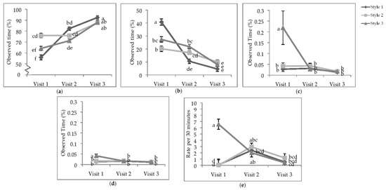 Least squares means of the visit by style interaction of state behaviours. Percentage of time (a) standing; (b) sitting; (c) running; (d) wing-assisted running; (e) the rate per 30 min of group locomotion. Visits one, two, and three were when the pullets were 25.9 ± 6.67; 68.0 ± 4.78 days of age; 112.1 ± 3.34 days of age. During visit one, the brooding compartments were closed, whereas during visits two and three, the brooding compartments were open into the litter areas. Error bars represent standard error. a–f Indicate significant differences between means (p < 0.05).