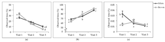 Least square means of the visit by colour interactions of state behaviours. Percentage of observed of time (a) sitting; (b) standing; (c) wing-assisted running. Visits one, two, and three were when the pullets were 25.9 ± 6.67; 68.0 ± 4.78 days of age; 112.1 ± 3.34 days of age. During visit one, the brooding compartments were closed, whereas during visits two and three, the brooding compartments were open into the litter areas. Error bars represent standard error. a–c Indicate significant differences between means (p < 0.05).