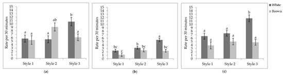 Interaction between aviary style and strain colour. The rate of wing flaps (p = 0.0012), aerial transitions (p = 0.0129), and vertical transitions (p = 0.0201) were affected by the interaction between aviary style and strain colour (Table 5). The rate of wing flaps (Figure 5a), aerial transitions (Figure 5b), and vertical transitions (Figure 5c) did not vary between strains within styles, except for S3, where white-feathered strains had a higher rate of all three locomotory events than all other combinations. However, the rate of wing flaps in S3 of white-feathered pullets did not differ from brown-feathered strains in S2. While lower in S1, the rate of aerial transitions did not differ between S2 and S1. White-feathered strains in S2 had a higher rate of aerial transitions than brown-feathered strains in S1.