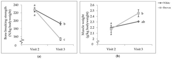 There was a visit by colour interaction that affected proportional tibia BBS (p < 0.0001; Table 6) and bicep weight (p = 0.0153; Table 7). While there was no difference between strain colours at V2, the tibia BBS of both white- and brown-feathered strains at V2 was significantly stronger than those at V3 (Figure 6a). At V3, white-feathered strains had proportionally stronger tibiae than brown-feathered strains. Furthermore, at V3, brown-feathered strains had proportionally heavier biceps than both white- and brown-feathered strains at V2 (Figure 6b).
