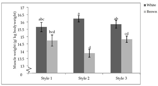 Finally, there was a significant interactive effect of aviary style and strain colour on the pectoralis minor weight (p = 0.0104; Table 7). Within strain colour, there were no differences between styles; however, white-feathered strains in S2 had significantly heavier pectoralis minor muscles than brown-feathered strains regardless of aviary style. White-feathered strains in S1 and S3 also had significantly heavier pectoralis minor muscles than brown-feathered strains in S2 and S3 (Figure 7).