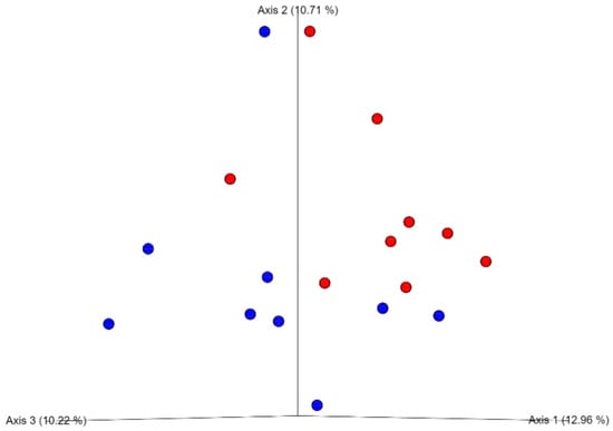 Principle coordinated analysis (PCoA) of the cecal microbiota of broilers at 21 days of age fed with or without inclusion of an enzymatic blend. Each point represents one sample (nine samples/treatment and a pool of cecal content from six birds/sample). Blue represents the samples from birds fed diets without enzyme supplementation, and red with enzyme supplementation.