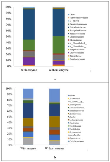 (a) Predominance of bacterial families and (b) bacterial genera present in the cecal microbiota of broilers at 21 days of age fed diets with or without inclusion of an enzymatic blend. The non-italicized groups represent bacteria that were identified to order- or family-level.
