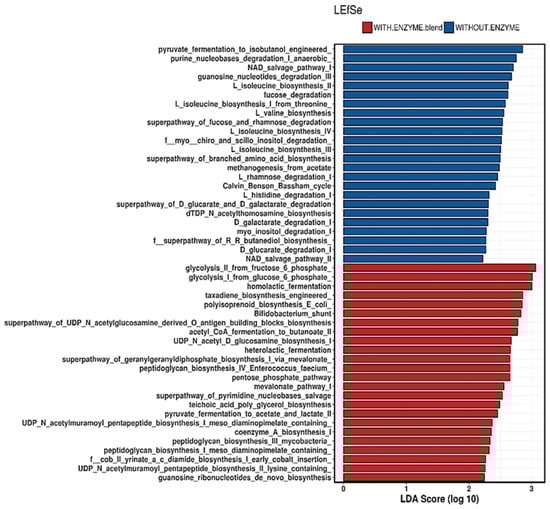 The linear discriminant analysis (LDA) effect size (LEfSe) was performed in order to evaluate the differences on the predicted metabolic pathways found in the cecal microbiota (Figure 3). Overall, it was observed that 48 pathways were predicted to be different in the cecal microbiota of birds supplemented or not with enzymes. Of these, 24 were upregulated in the unsupplemented group and 24 were upregulated in the supplemented group. An enrichment of protein related pathways in the cecal microbiota of unsupplemented birds was observed, while a higher prevalence of carbohydrate-related pathways in the microbiota of birds supplemented with enzymes was observed.
