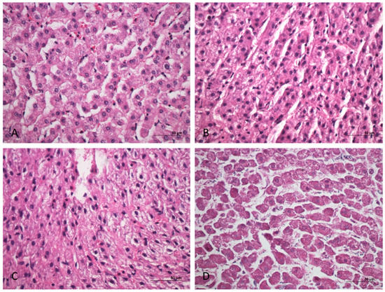 Cattle liver. Examples of histopathological scoring model. (A) Easily identifiable rounded nuclei, with one or more big nucleoli, multifaceted cytoplasm, and without alterations (nuclei and cytoplasm: score 5). (B) Mild hydropic degeneration and intracellular vacuoles. Nuclei in eccentric position (nuclei and cytoplasm: score 4). (C) Structural alteration of the liver. Indistinguishable nucleoli (nuclei and structure: score 3). (D) Pyknotic or absent nuclei and severe structural alteration (nuclei and structure: score 1). Hematoxylin and eosin (H&E).