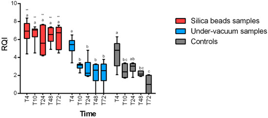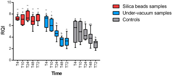 RQI (RNA quality indicator) values were higher than 4, which reflect an acceptable quality of RNA at any time and any temperature for samples preserved with silica beads. A statistically significant positive effect of the preservation method (p < 0.0001 for 4 °C and 24 °C) on RNA integrity for silica bead samples was revealed. RNA quality was significantly higher in samples stored with silica beads at any time (Figure 3 and Figure 4) compared to samples stored without any method of conservation. Under-vacuum-preserved samples gave acceptable results only for samples stored at 4 °C and until 10 h after sampling (p < 0.05). After 10 h, RQI was <4 for all the samples at any temperature (Figure 3 and Figure 4).
