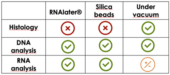Regarding nucleic acid conservation, liquid nitrogen is considered the gold standard for tissue storage in terms of guaranteeing an optimal biomolecular quality for future analysis [14,15]. As an alternative, ultralow temperature freezer can be used, but usually both preservation methods are not available immediately after tissue collection [16], especially in “in-field” conditions. In this framework, RNAlater can be a valid solution for molecular analysis, especially on-site, although it is very expensive compared to other methods [17]. Despite these considerations, there are some discrepancies regarding the impact of RNAlater on the preservation of tissue morphology. In some studies, RNAlater maintained a satisfactory tissue morphology [16], while in others, tissue morphology was poorly preserved [10] or substantial differences were recorded among different tissues [18].