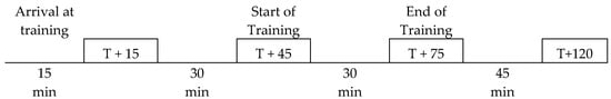 The third sample was taken, again, 30 min after the dogs had finished their training exercise (T + 75). They were subsequently given 45 min of free time after training, at the end of which the fourth sample was collected (T + 120) (see, also, Figure 1). During these 45 min, dogs were free to either play with other dogs present, play with their handlers, go for a walk with their handlers, or rest.