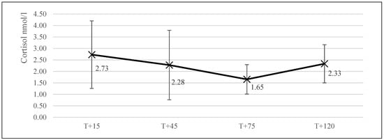 The average salivary cortisol level of the dogs at the start of the collective training day (T + 15; n = 13) was 2.73 nmol/L (±1.47). At the start of training (T + 45, n = 16), this level was 2.28 nmol/L (±1.51). It was 1.65 nmol/mL (±0.64) at the end of training (T + 75, n = 16), and finally, 2.33 nmol/L (±0.83, n = 14) 45 min after the training session had ended (T + 120; Figure 2).