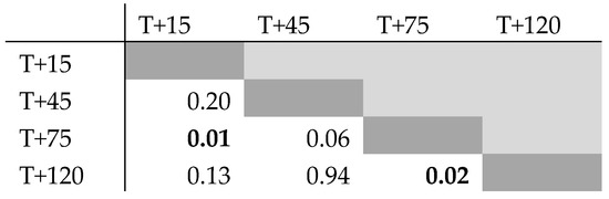 The Skillings–Mack test statistic was 33.05 (p = 0.01, α = 0.05), which indicates that the four measurement points of this study differed from one another. To identify which specific data points caused this result, an additional analysis was performed via Wilcoxon signed rank test between all data points in combination with a Holm–Bonferroni correction. The Wilcoxon signed rank tests indicated the data points T + 15/T + 75 and T + 75/T + 120 to be significantly different (Figure 3). The Holm–Bonferroni correction, however, did not yield significant differences between combinations. This combination of results indicates that T + 15/T + 75 and T + 75/T + 120 might be significantly different, though a Type I error cannot be excluded. All other data point combinations did not differ significantly from one another in both tests. Mauchly’s and Levene’s tests were finally performed to test for sphericity (p = 0.49) and equal variance (p = 0.10) of the dataset, respectively.
