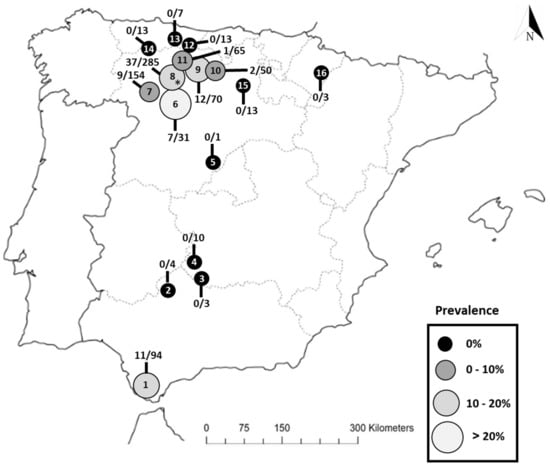Between 2003 and 2014, and in the framework of different studies, samples from wild micromammals were collected in 16 locations in mainland Spain using LFATDG Sherman Live Traps (7.62 cm × 8.89 cm × 22.86 cm, H. B. Sherman Traps, Inc., Tallahassee, FL, USA) (Figure 1 and Table 1). Capture and handling procedures for sampling were approved by the UCLM Ethics Committee (reference number CEEA: PR20170201) and were in accordance with the Spanish and European policy for animal protection and experimentation. The researchers and technicians involved in the captures only employed gloves as personal protective equipment. Some of the individuals captured were randomly selected, sedated with an intramuscular injection of a solution containing Ketamin (10 mg/kg) and medetomidine (1 mg/kg) and thereafter humanely euthanised by cervical dislocation. These animals were transported refrigerated to our labs where a detailed necropsy was performed under biosafety 2 containment in cabinets, and tissue samples were collected and preserved frozen at −20 °C. Vaginal swabs (Aluminium + viscose AMIES swabs, Deltalab, Spain) were collected from live female M. arvalis captured in northwestern Spain along 2012. The swabs were thereafter preserved frozen at −20 °C until DNA purification. Some species (Arvicola terrestris, Sciurus vulgaris and Eliomys quercinus; Table 2) were surveyed after being found dead close to trap capture sites or by environment agents and brought to the lab for necropsy.