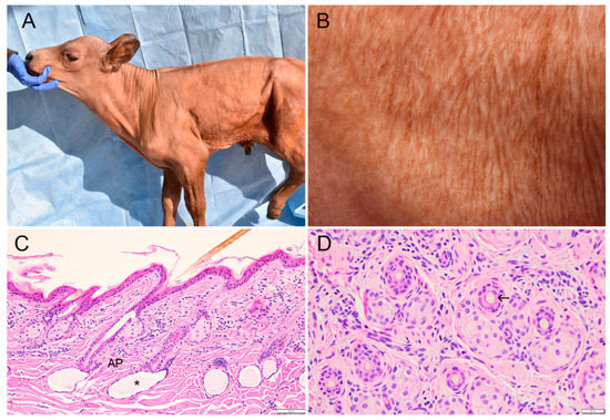 Cutaneous clinicopathological findings in a Red Angus-Simmental calf with hypohidrotic ectodermal dysplasia. (A) Case 3 at 10 days of age. Absence of visible hairs on neck, trunk, upper limbs or most of the face, with exception of eyelashes and pinna. (B) Case 3 at 10 days of age. Higher magnification of skin from flank showing small fine hairs grouped in linear dorso-ventral patterns. (C) Flank skin; case 3. Uniformly small hair follicles with associated sebaceous glands, pigmented hair shafts, and arrector pili muscles (AP). Sweat glands are closely associated with dermal papillae and contain lightly stained secretion (asterisk). Note mild lymphocytic dermatitis in upper to mid-dermis. Bar: 50 µm. (hematoxylin and eosin stain (H&E)). (D) Flank skin; case 1. Follicles contain hair shafts (arrow) and are associated with unremarkable sebaceous glands. No orphan sebaceous glands are present. Bar: 25 µm. (H&E).