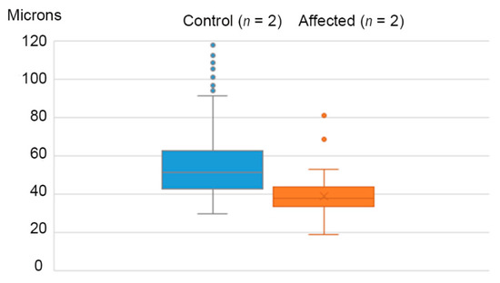 Comparison of median diameter of hair follicles in two control calves (blue) and two affected calves (orange; cases 1 and 3). In the control calves, 14 follicles were >120 µm diameter and not illustrated; they are included in the median. Median follicular diameters are 49.9 and 38.1 µm in unaffected and affected animals, respectively.