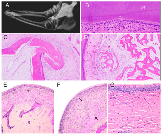 Dental anomalies in a hypohidrotic ectodermal dysplasia-affected calf. (A) Mandible (radiograph); case 3. Incisors are absent. Premolar teeth are narrow and lack the complex apical and root structures of cheek teeth in unaffected neonatal calves. No permanent teeth have developed. (B) Premolar tooth; case 3. Mildly disordered ameloblasts with scant apoptosis (asterisk) adjacent to enamel (EN). Small amorphous aggregates of mineralized material, probably enamel, in papillary layer (arrow). (H&E stain). (C) Premolar tooth; case 3. Disorderly focus of secondary dentin or osteodentin covered with nodular aggregate of cementum projects into alveolus. (H&E stain). (D) Premolar tooth; case 3. New bone formation extending into alveolus. (H&E satin). (E) Nasal concha, case 3. Mucosal glands, which in normal calves lie between vascular cavernous stratum and the mucosal surface (asterisk), are absent. (H&E stain). (F) Ethmoidal concha, case 3. Olfactory glands (between arrows) are present beneath mucosal epithelium. (H&E stain). (G) Trachea, case 3. Note the complete absence of tracheal glands. (H&E stain).