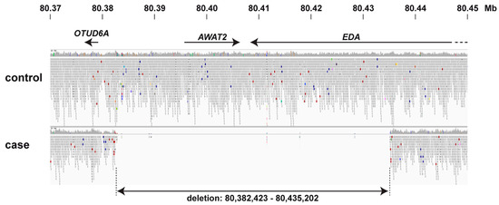Filtering of the obtained variant catalogue for private variants exclusively present in the genome of the affected calf and absent in 496 available control genomes identified any private protein-changing variants. As our automated variant calling was limited to single nucleotide and small indel variants, we additionally performed a visual analysis for large structural variants in four known HED candidate genes (EDA, EDAR, EDARADD, WNT10A). This analysis revealed a large ~53 kb deletion on the X chromosome in the affected calf 3. It can be formally designated as ChrX:80,382,423_80,435,202del52,780 (ARS-UCD1.2 assembly). The deletion was flanked by highly similar sequences that showed 95% sequence identity over 259 bp suggesting that the deletion may have arisen during an unequal crossing over event. The deleted region encompassed the entire AWAT2 gene and the last six exons of the EDA gene (Figure 4).