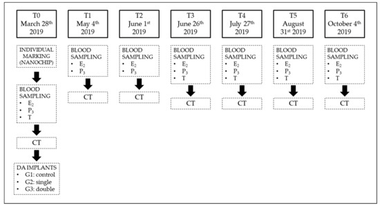 From T0 (prior to DA implantation) to T6, a blood sample from the cervical plexus was obtained from each animal and stored in a lithium heparine test tube; plasma was immediately separated by centrifugation and frozen at −20 °C. The samples were processed no more than 15 days after collection. Estrogen (17β-estradiol, E2) and progesterone (P3) plasmatic concentration were measured for every time point. Testosterone (T) plasmatic concentration was measured at T0, T3, T4, T5, and T6. Fluorescence polarization immunoassay (FPIA, competitive enzyme immunoassay) technology of the Tosoh 600 Analyzer was used to evaluate plasma E2, P3, and T concentration. For E2, linearity was between 25 and 3000 pg/mL, while intra- and inter-assay variability were, respectively, 4.03% and 6%. For P3, linearity was between 0.1 and 40 ng/mL, while intra- and inter-assay variability were, respectively, 2.2% and 2.8%. For T, linearity was between 10 and 2200 ng/dL, while intra- and inter-assay variability were, respectively, 3.2% and 3.7%.