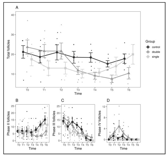 Comparison of the number of follicles between experimental groups and across timepoints. (A) Comparison between the control (black), single-implant (light gray), and double-implant (dark gray) groups. (B–D) Comparison between the three experimental groups for follicles in phases II (B), III (C), and IV (D) separately. In all panels, large dots represent means by group and timepoint, and vertical bars represent standard errors.