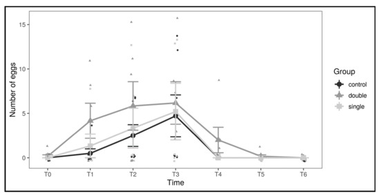 Number of oviductal eggs by experimental group and across timepoints. Large dots represent means by group and timepoint, and vertical bars represent standard errors.