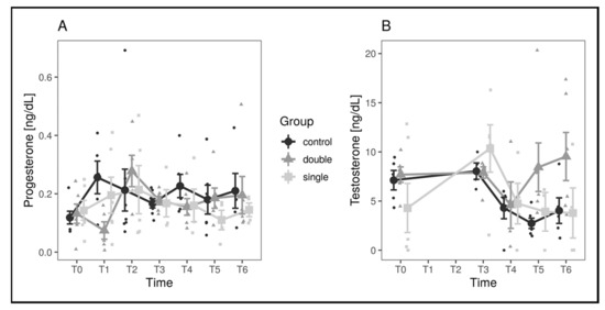 Hormone concentration values in the different experimental groups and across timepoints. Progesterone values are shown in panel (A), while testosterone values are shown in panel (B). Large dots represent means by group and timepoint, and vertical bars represent standard errors.