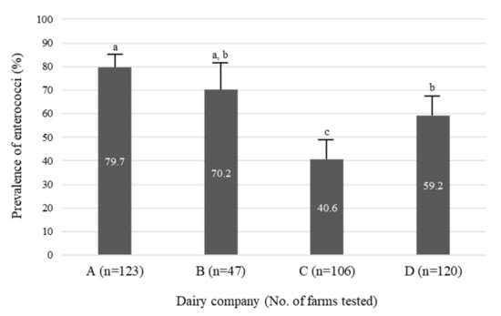Enterococci can be an opportunistic pathogen in milk that leads to clinical or subclinical mastitis [19]. Since enterococci can easily spread antimicrobial-resistance or virulence genes via horizontal transfer, the presence of enterococci in milk can enhance the emergence of MDR strains, which can eventually affect the choice of drug [19]. In this study, the prevalence of E. faecalis and E. faecium differed significantly in bulk tank milk samples from four dairy companies. The presence of environmental pathogens such as enterococci in bulk tank milk is associated with poor hygiene. Good hygienic practices in dairy livestock management are important in reducing udder contamination from microbial sources such as the environment, feces, and slurry [20].