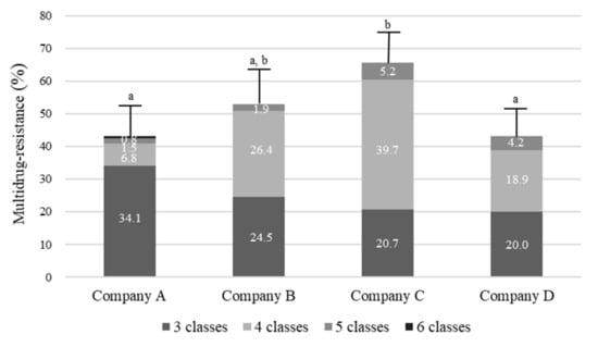 The distribution of 164 MDR enterococci in samples of bulk tank milk from four dairy companies is shown in Figure 2. The prevalence of MDR was also significantly different depending on the source company (p < 0.05). In particular, MDR (70.4%) in enterococci isolated from samples obtained from company C showed a significantly higher rate than isolates from the samples obtained from other companies (p < 0.05). Although one isolate of enterococci (0.8%) from company A showed MDR against six antimicrobial classes, 45 isolates (34.1%) and 19 isolates (20.0%) from companies A and D, respectively, showed the highest MDR against three classes. Moreover, 14 isolates (26.4%) and 23 isolates (39.7%) from companies B and C, respectively, showed the highest MDR against four classes.