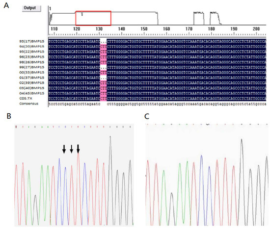Sequencing results of exon 1 of the BMP15 gene. (A) Comparison of sequence exon 1; (B) sequence of wild-type (without mutation) at E1+28-30 site of exon 1; (C) sequence of mutation (missing CTT) at E1+28-30 site of exon 1.