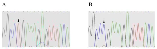 Sequencing results of exon 2 of the BMP15 gene. (A) Sequence of wild-type E2+755 at the site of BMP15 exon 2; (B) sequence of mutation (T–C) at the E2+755 site of BMP15.