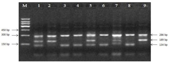 Tetra-primer amplification refractory polymorphism system PCR (Tetra-ARMS-PCR) was used to amplify B1 to identify the missing CTT using the four primers listed in Table 1. PCR products were separated on a 3% agarose gel and visualized with the VDS system. The fragment size showed fragments of 189 and 286 bp that were missing CTT (homozygous); 134, 189, and 286 bp (heterozygous); 134 and 286 bp that were the wild-type genotype (no missing CTT), and a fragment of 286 bp indicated the control size in each array.