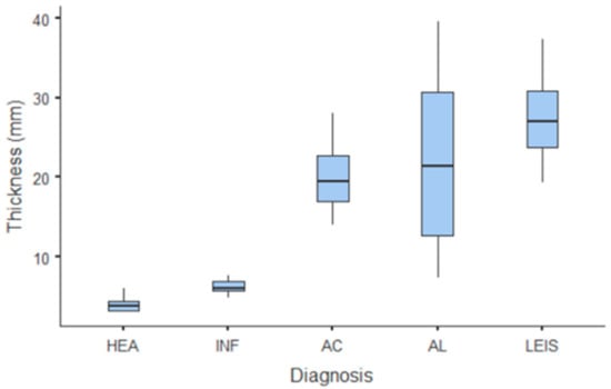 Box and whisker plot of the gastric wall thickness for healthy (HEA), inflammatory (INF), adenocarcinoma (AC), lymphoma (AL), and leiomyosarcoma (LEIS).