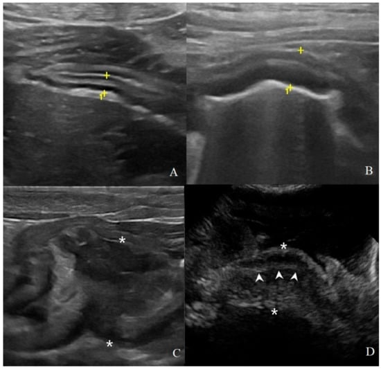 Classification of gastric wall layer definition on B-mode US: (A) normal: all the five layers are easily identified and thickness is normal, (4.1 mm between the cursors (+) in a HEA dog); (B) reduced: the identification of the layers is more difficult; in addition to a mild diffuse wall thickening (6.5 mm between the cursors in a INF dog); (C) absent: it is not possible to recognize the normal wall stratification and layer definition is lost. Here, a focal transmural mass of 37.5 mm between the asterisks in a gastrointestinal stromal tumor (GIST) with mixed echogenicity; (D) pseudolayering: wall, between the asterisk (*), with moderately echogenic line (arrowheads) surrounded by an outer and inner poorly echogenic areas in a dog with gastric adenocarcinomas.