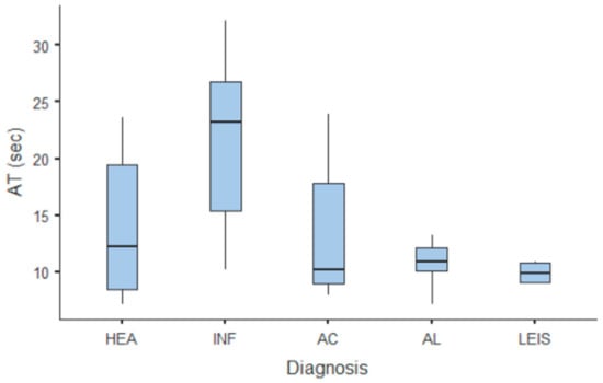 Box and whisker plot of the arrival time (AT) for healthy (HEA), inflammatory (INF), adenocarcinoma (AC), lymphoma (AL), and leiomyosarcoma (LEIS).