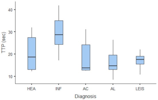 Box and whisker plot of the time to peak (TTP) for healthy (HEA), inflammatory (INF), adenocarcinoma (AC), lymphoma (AL), and leiomyosarcoma (LEIS).