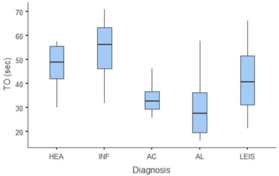 Box and whisker plot of the time to fall (TO) for healthy (HEA), inflammatory (INF), adenocarcinoma (AC), lymphoma (AL), and leiomyosarcoma (LEIS).
