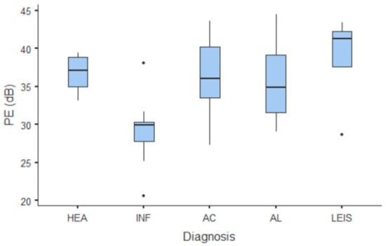 Box and whisker plot of the peak enhancement (PE) for healthy (HEA), inflammatory (INF), adenocarcinoma (AC), lymphoma (AL), and leiomyosarcoma (LEIS).