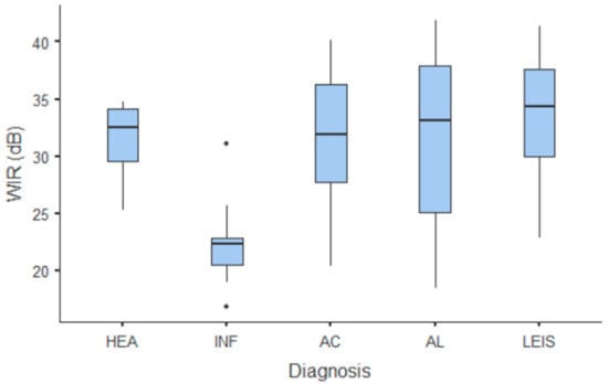Box and whisker plot of the wash-in rate (WiR) for healthy (HEA), inflammatory (INF), adenocarcinoma (AC), lymphoma (AL), and leiomyosarcoma (LEIS).